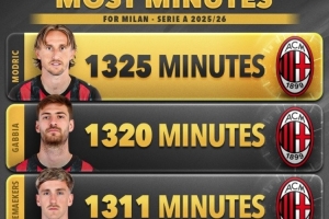體育資訊12月15日訊 Score90統(tǒng)計(jì)了米蘭球員本賽季意甲出場時(shí)間,并列出榜單,40歲莫德里奇1325分鐘居首,他僅有25分鐘未在場上。