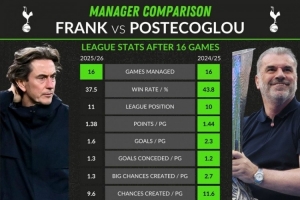 危?弗蘭克執(zhí)教熱刺前16輪勝率、進球等數(shù)據(jù)均不如澳波上賽季同期