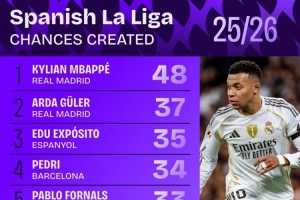 體育資訊12月16日訊 Squawka統(tǒng)計了球員本賽季在西甲創(chuàng)造機會的次數(shù),并列出榜單,姆巴佩48次居首,居萊爾37次第二。