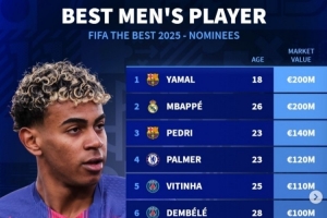 體育資訊12月16日訊 2025年FIFA年度最佳頒獎典禮將在就卡塔爾多哈舉行,年度最佳球員(世界足球先生)也將揭曉?!掇D會市場》也列出了入選提名球員的身價排行榜,亞馬爾和姆巴佩并列居首。