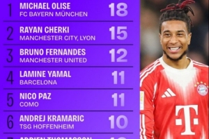 體育資訊12月31日訊 數(shù)據網站Squawka盤點了2025年五大聯(lián)賽助攻榜,其中拜仁球員奧利塞居首,具體如下: