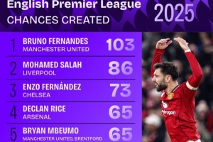 體育資訊1月1日訊 Squawka統(tǒng)計2025年英超球員創(chuàng)造機會榜,B費103次居首,薩拉赫第二,恩佐第三。