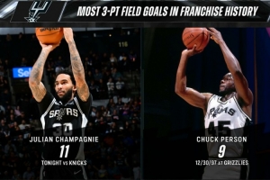 11記三分打破馬刺隊史單場三分球命中紀(jì)錄,此前由查克·珀森保持(9記)。