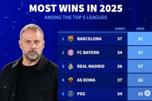 體育資訊1月1日訊 2025年已經(jīng)結(jié)束,《轉(zhuǎn)會市場》也統(tǒng)計了本年度五大聯(lián)賽勝場最多情況,巴薩獨自居首。