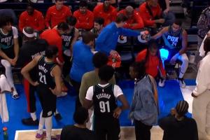 GIF-楊瀚森和阿夫迪亞主動(dòng)溝通 不過后者似乎有些沒懂 喊了翻譯過來之后聽懂 隨后和楊瀚森碰拳