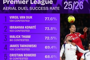體育資訊1月3日訊 數(shù)據(jù)機構squawka統(tǒng)計了本賽季英超爭頂成功率情況,利物浦雙中衛(wèi)包攬前二。