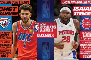 體育資訊01月03日訊 NBA官方宣布,活塞斯圖爾特與雷霆霍姆格倫分別當選12月東西部月最佳防守球員。