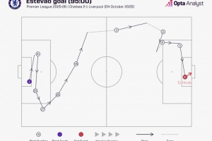 據(jù)Opta統(tǒng)計(jì),10名切爾西球員(埃斯特旺被計(jì)算在內(nèi))參與埃斯特旺的進(jìn)球,整個(gè)過(guò)程僅用28秒。