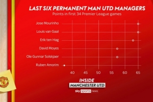 執(zhí)教曼聯(lián)的前34場(chǎng)英超比賽,索爾斯克亞和莫耶斯均拿到了57分,滕哈赫拿到了63分,而范加爾和穆里尼奧均拿到了65分。