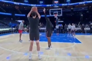 今天上來(lái)就一個(gè)三分!今天楊瀚森賽前練三分,果然有效果!