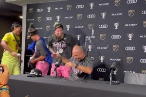 邁阿密?chē)?guó)際球員闖入馬斯切拉諾新聞發(fā)布會(huì),向他潑灑啤酒慶祝