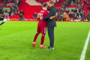杰拉德和麥克馬納曼祝賀薩拉赫為利物浦打入第250粒進(jìn)球??
